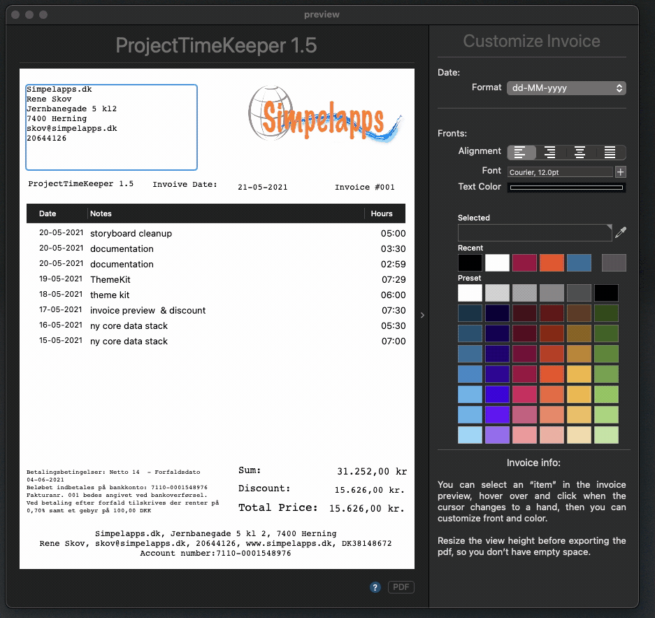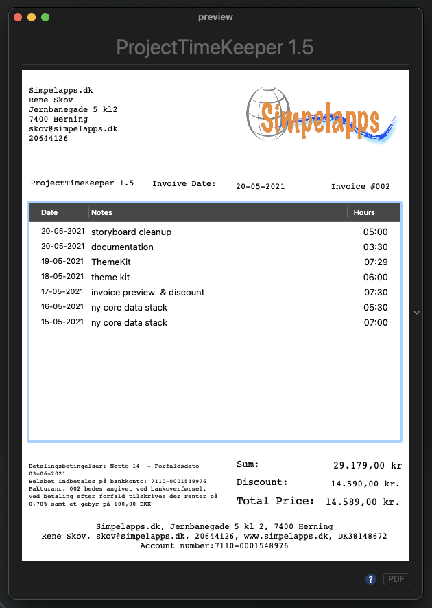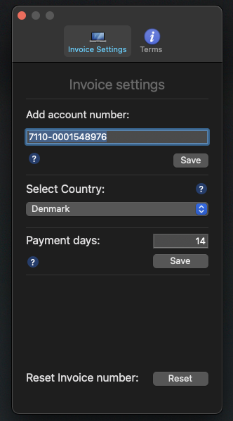 - if you click on ProjectTimeKeeper in the menu bar at the top you will enter invoice settings, you have written your account number and your payment deadline in days, as well as the invoice number.