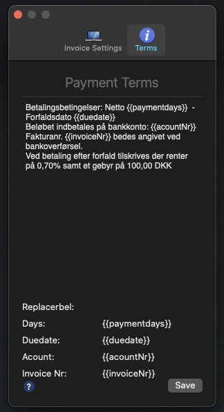Leve the replaceable items as is, for the app to replace it with the data from Invoice Settings, and show your invoice due-date.